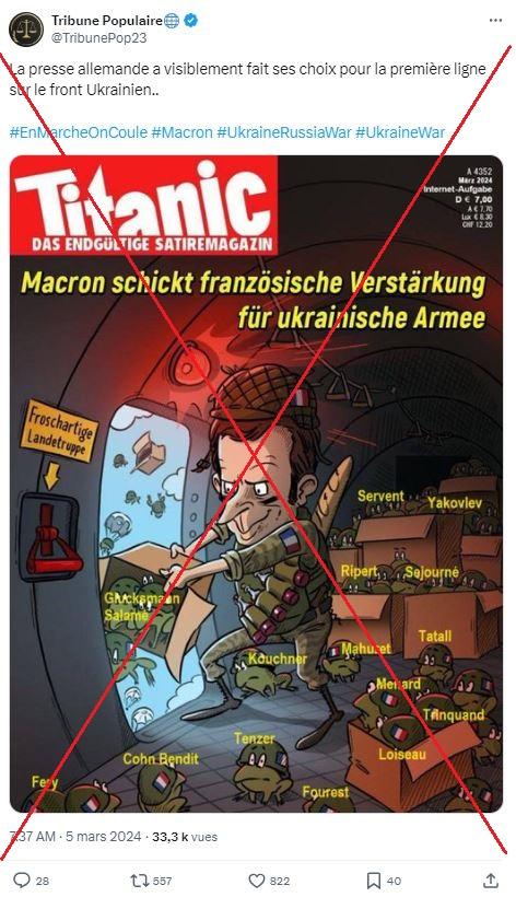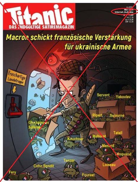 Deux ans après le début de la guerre en Ukraine, Emmanuel Macron a estimé le 26 février 2024 que l'envoi de troupes occidentales au sol ne pouvait être exclu. Huit jours plus tard, des publications sur Facebook et X relayaient une supposée Une du magazine satirique allemand Titanic moquant le président français. Le dessin le montre en train de larguer depuis un avion militaire des renforts, sous la forme de grenouilles portant les noms de responsables politiques, commentateurs et experts français qui se sont exprimés sur le conflit et ces déclarations du président français. Mais cette Une est fausse, comme l'a confirmé le magazine à l'AFP. A l'instar de l'hebdomadaire satirique français Charlie Hebdo, ce n'est d'ailleurs pas la première fois que Titanic est la cible de fausses Unes alimentant un narratif pro-russe relayé sur les réseaux sociaux.