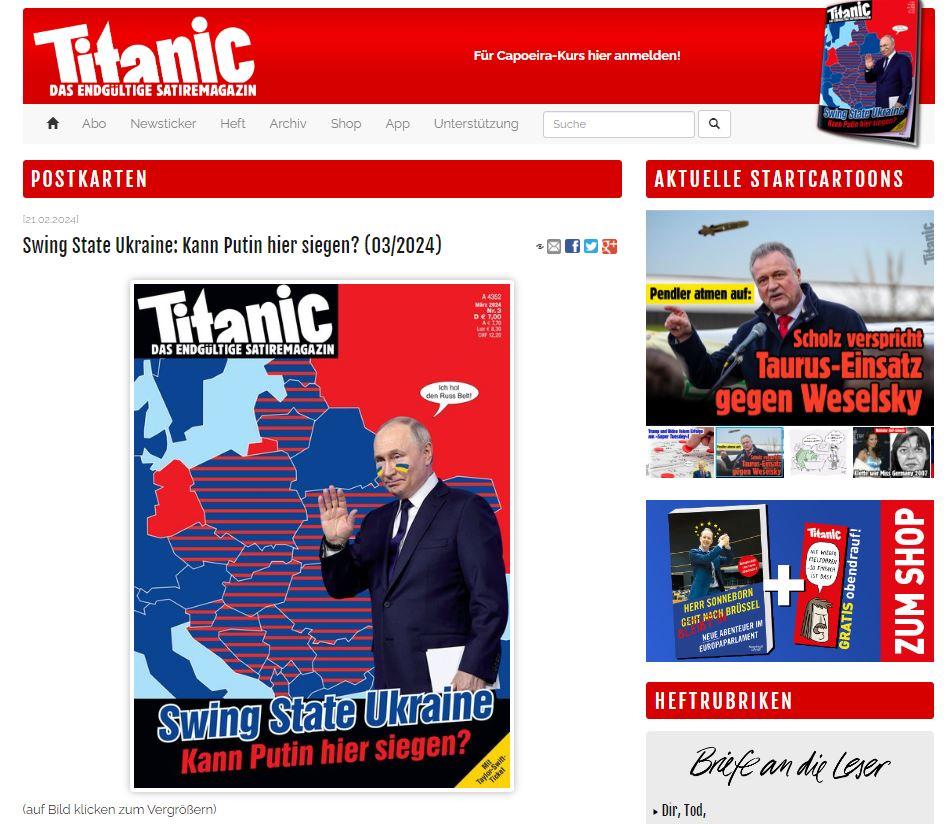 La véritable Une de l'édition de mars de Titanic, que l'on retrouve sur le site du magazine, ne ressemble en effet en rien à la caricature relayée sur les réseaux sociaux (archive) : elle met en scène une photo du président russe Vladimir Poutine devant une carte de l'Europe de l'Est avec un jeu de mots sur l'Ukraine "Etat charnière" ("swing state") - vocable utilisé habituellement dans le cadre de la présidentielle américaine, pour désigner un état susceptible de basculer politiquement d'un côté ou de l'autre.