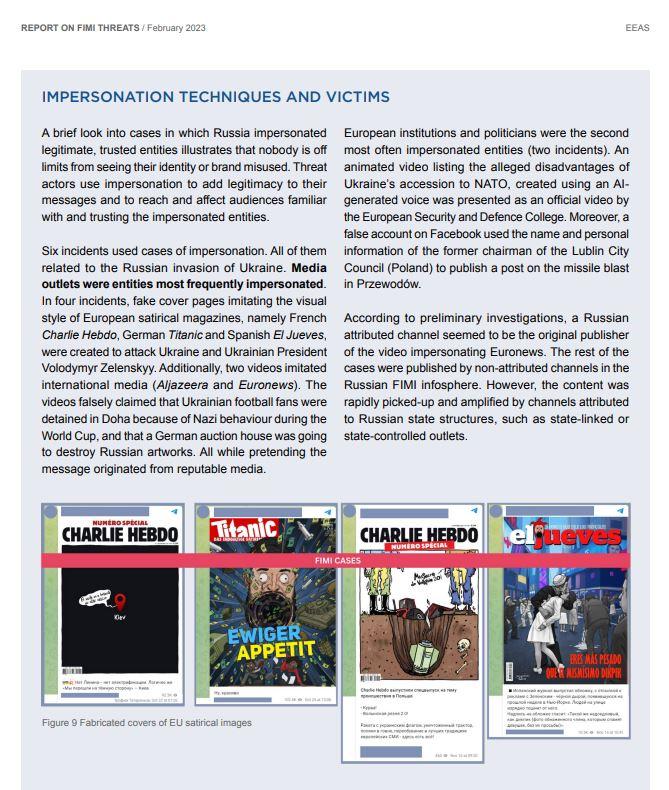 Un rapport de l'Union européenne sur la manipulation de l'information et les ingérences étrangères publié en février 2023 a mentionné ces cas de fausses Unes ayant touché Titanic et Charlie Hebdo, mais aussi le magazine satirique espagnol El Jueves, en considérant que la Russie en était à l'origine et que des comptes pro-russes avaient contribué à les relayer (archive).