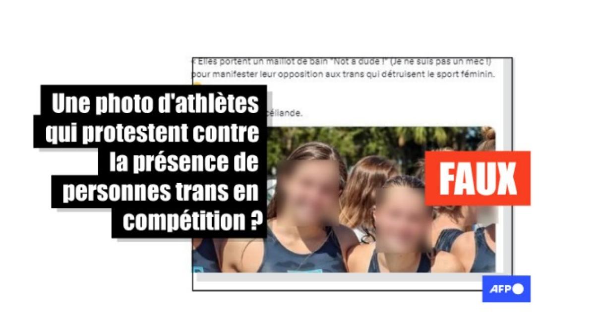 "Elles portent un maillot de bain 'Not a dude !' (Je ne suis pas un mec !) pour manifester leur opposition aux trans qui détruisent le sport féminin", énonce la légende d'une publication Facebook relayée plusieurs centaines de fois, accompagnée d'un émoji souriant et diffusant une photo montrant des jeunes athlètes.