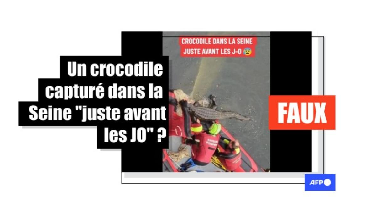Mais ces images sont anciennes et ne montrent pas la Seine : elles ont été filmées en mai 2023 à Bergerac, en Dordogne, où une alerte municipale sur la présence d'un crocodile avait semé l'agitation, avant que les pompiers ne réalisent, au cours de leur intervention, qu'il s'agissait en réalité d'un faux animal, comme l'avait notamment relaté l'AFP dans une dépêche (lien archivé).