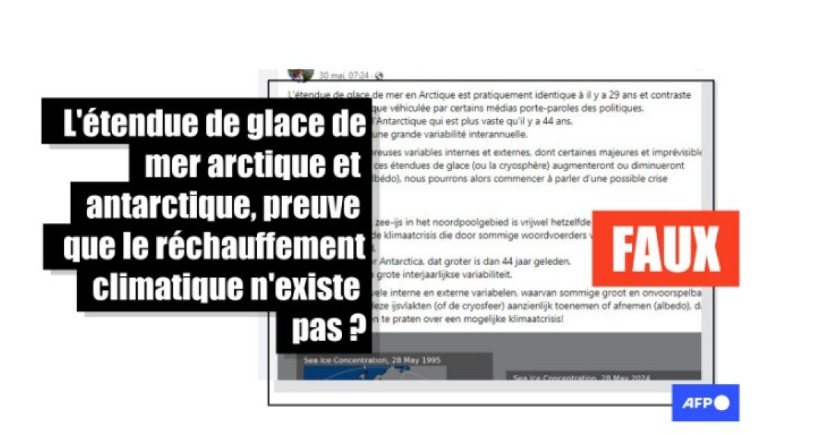 "L'étendue de glace de mer en Arctique est pratiquement identique à il y a 29 ans et contraste avec la crise climatique véhiculée par certains médias porte-parole des politiques. Idem pour celle de l'Antarctique qui est plus vaste qu'il y a 44 ans. Témoignant ainsi d'une grande variabilité interannuelle. Le jour où les nombreuses variables internes et externes, dont certaines majeures et imprévisibles, feront en sorte que ces étendues de glace (ou la cryosphère) augmenteront ou diminueront significativement [...], nous pourrons alors commencer à parler d'une possible crise climatique!", soutiennent différents internautes dans des publications partagées plusieurs milliers de fois en France et en Belgique sur Facebook fin mai 2024 (1, 2, 3).
