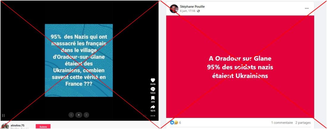 "95% des nazis qui ont massacré [les habitants] d'Oradour-sur-Glane étaient des Ukrainiens" : c'est ce que soutenaient des internautes sur TikTok, Facebook (1, 2, 3) ou encore X (ex-Twitter), début juin 2024, à quelques jours de la commémoration des 80 ans du massacre perpétré par des nazis dans ce village de Haute-Vienne, le 10 juin 1944, pendant la Seconde Guerre mondiale.
