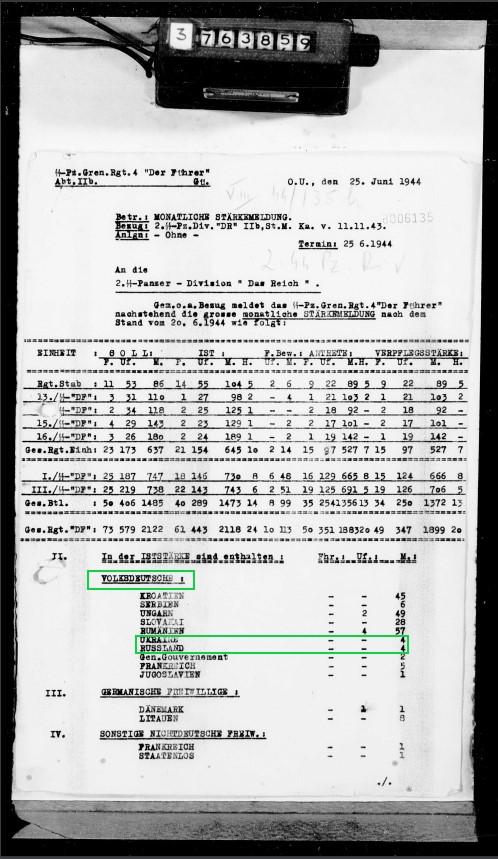 "On voit, dans le régiment, [un total de] 2.646 hommes, dont quatre 'Volksdeutsche' venus d'Ukraine et quatre autres 'Volksdeutsche' venus de Russie, ainsi que 24 auxiliaires soviétiques, les 'Hilfswillige', les soldats soviétiques qui étaient incorporés à l'armée allemande [...] comme supplétifs, ils ne pouvaient pas être officiers, c'était des soldats de seconde zone", détaille Nicolas Bernard.