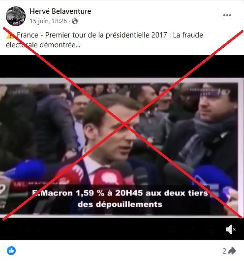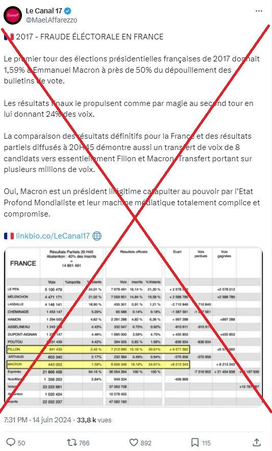 "2017 - FRAUDE ELECTORALE EN FRANCE Le premier tour des élections présidentielles françaises de 2017 donnait 1,59% à Emmanuel Macron à près de 50% du dépouillement des bulletins de vote. Les résultats finaux le propulsent comme par magie au second tour en lui donnant 24% des voix", affirme le 14 juin 2024 une publication sur X, relayée plus de 750 fois trois jours plus tard. Elle déduit de ce chiffre que "Macron est un président illégitime catapulter [sic] au pouvoir par l’Etat Profond Mondialiste et leur machine médiatique totalement complice et compromise".