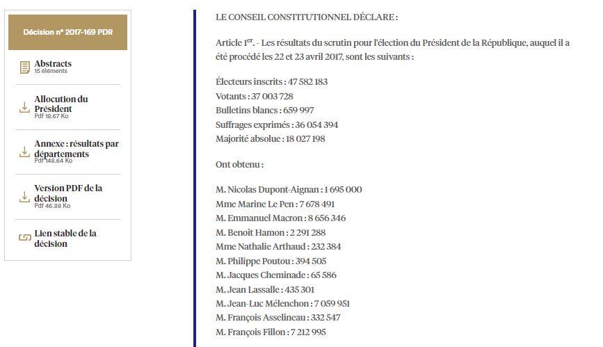 Le Conseil constitutionnel a ensuite validé et publié les résultats sur son site internet le 26 avril, confirmant qu'Emmanuel Macron avait bien recueilli le plus de voix (8.656.346), devant Marine Le Pen (7.678.491), sur 36.054.394 suffrages exprimés (archive) :