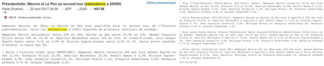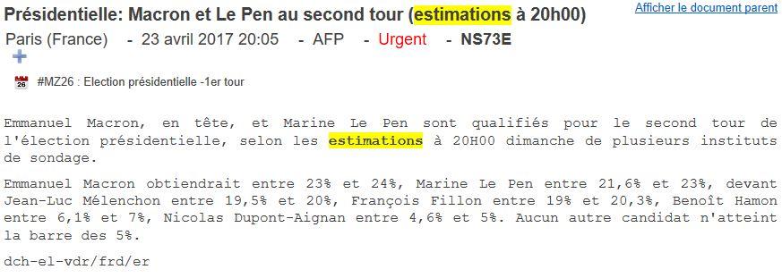 Si l'on se replonge dans les archives de l'AFP pour cette soirée du 23 avril 2017, les premières estimations des instituts de sondage à 20H00 confirmaient qu'Emmanuel Macron était alors bien en tête, talonné par Marine Le Pen, comme on peut le voir dans cet extrait d'une dépêche AFP publiée à 20H05 :