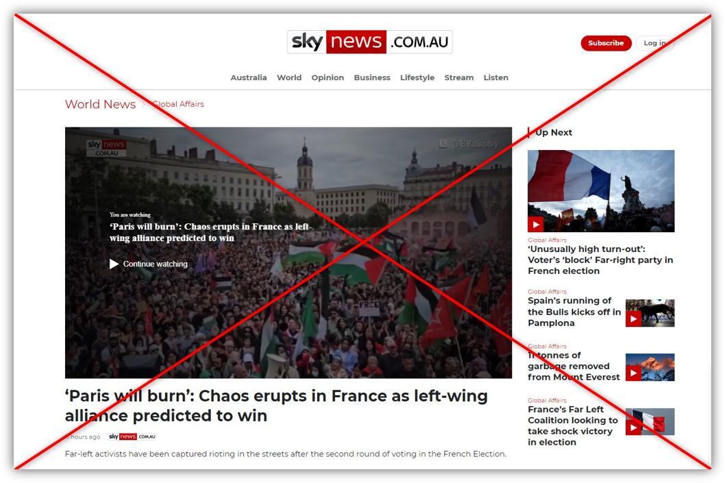 La vidéo a aussi été massivement relayée en anglais comme ici, où l'internaute affirme que "Le rassemblement de la victoire du nouveau gouvernement français compte plus de drapeaux palestiniens que de drapeaux français". Elle a aussi été reprise par le média australien Sky News.