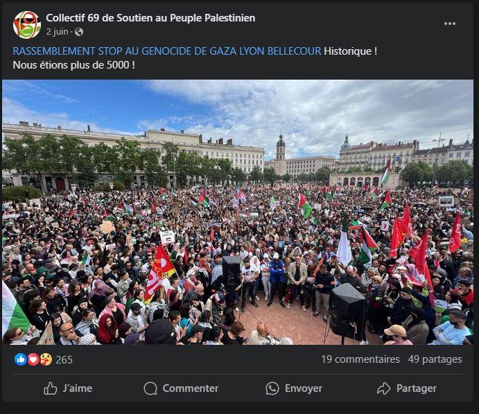 Autre élément confirmant cette manifestation du 1er, le collectif 69 de soutien au peuple palestinien avait appelé au rassemblement sur ses réseaux sociaux ainsi que sur son site web (archivés ici et ici). Et le collectif a partagé le lendemain sur sa page Facebook une photo de cette manifestation le 2 juin 2024 (archivé ici).