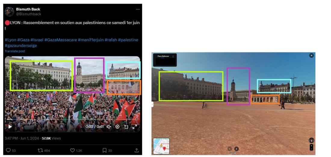 Quant à la localisation, celle-ci se confirme aussi en recherchant Place Bellecour sur Google Street View(archivé ici). Sur les images de Google Street View et celles de la vidéo figurent en effet les mêmes bâtiments.