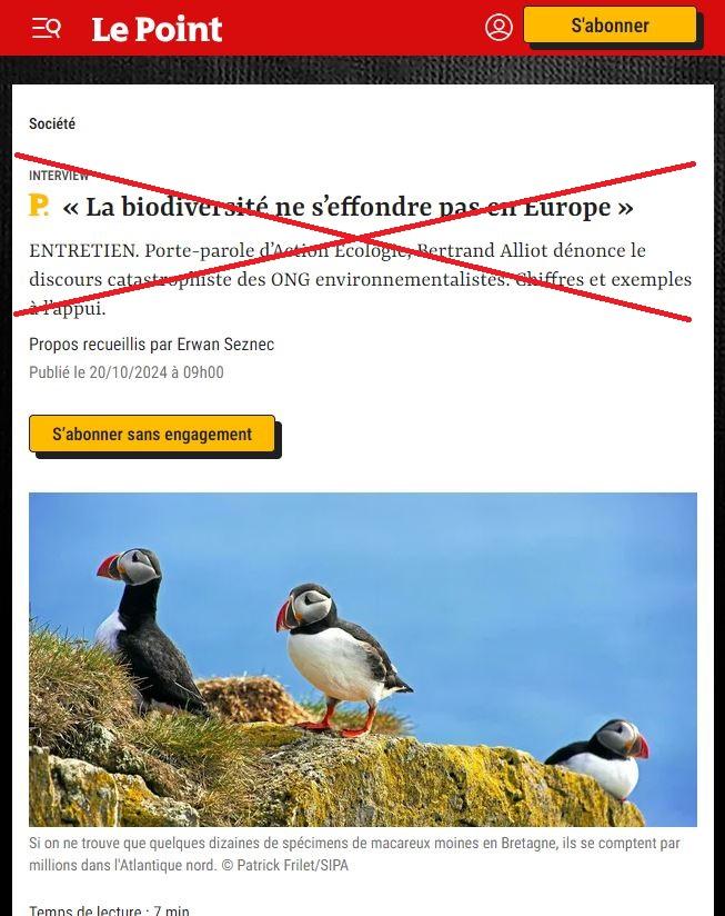 Dans ce contexte, un entretien paru sur le site du Point le 20 octobre a suscité l'émoi de scientifiques et défenseurs de l'environnement. Interrogé par l'hebdomadaire, Bertrand Alliot, le porte-parole de l'association Action Ecologie, affirme en parlant des vertébrés que "la biodiversité ne s'effondre pas en Europe". Cet ex-membre du conseil d'administration de la Ligue de protection des oiseaux (LPO), qui publie désormais des contributions dans la revue Transitions et énergies, dans le magazine d'extrême droite Valeurs actuelles et dans Causeur, dénonce le "catastrophisme" des ONG, arguant que "des espèces reculent, mais d'autres reviennent", et que "le regain de forme des mammifères est spectaculaire, impossible à nier".