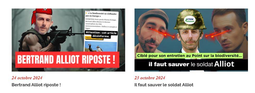 Dans un billet publié sur son site le 23 octobre, l'association Action Ecologie a assuré qu'elle "ne se laissera pas intimider", réaffirmant que "Bertrand Alliot a exposé une réalité : la biodiversité en Europe n'est pas en voie d'effondrement généralisé, et c'est un fait appuyé par des données tangibles".