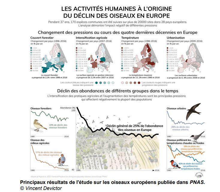 Par exemple, une étude de scientifiques du CNRS et de l'Université de Montpellier portant pendant 27 ans sur 170 espèces d'oiseaux communs sur plus de 20.000 sites dans 28 pays européens, et publiée en mai 2023 dans la revue américaine Proceedings of the National Academy of Sciences, a montré que "le nombre d'oiseaux a décliné de 25% en 40 ans sur le continent européen, voire de près de 60% pour les espèces vivant en milieu agricole" (archives 1, 2).