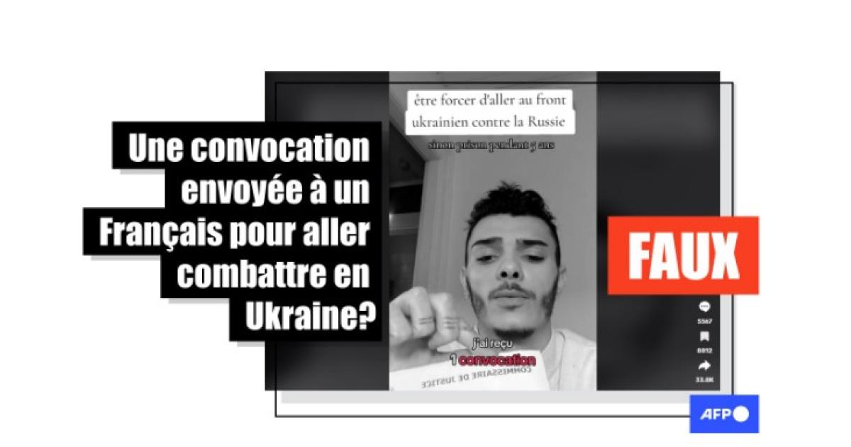 L'internaute affirme, dans une vidéo en noir et blanc, qu'il a été convoqué par courrier "suite à la déclaration de la guerre de la Russie contre la France" pour aller combattre "au front de guerre en Ukraine". En cas de refus, ajoute-t-il, il s'exposerait selon le courrier à "cinq ans d'emprisonnement et à une amende pouvant aller jusqu'à 500.000 €". Il serait par ailleurs prié "de prévenir sa famille et son entourage de son départ imminent".