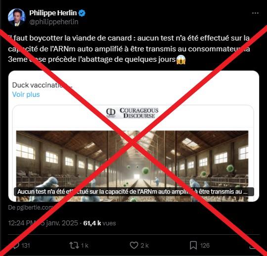 "Il faut boycotter la viande de canard : aucun test n’a été effectué sur la capacité de l’ARNm auto amplifié à être transmis au consommateur, la 3eme dose précède l’abattage de quelques jours", alerte ainsi l'économiste Philippe Herlin - dont les propos ont plusieurs fois fait l'objet d'articles de vérification de l'AFP (1, 2).