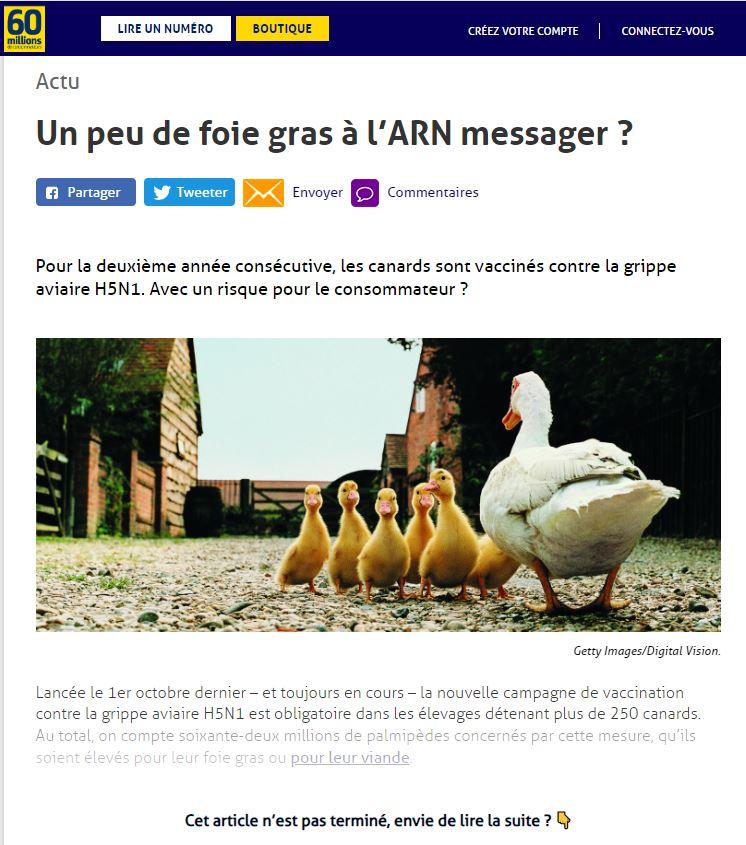 Le magazine 60 millions de consommateurs (lien archivé ici) a d'ailleurs révélé dans un article publié le 16 décembre avoir reçu quelques courriers "s'inquiétant d’une éventuelle contamination de la viande ou du foie gras de canard". "Avec une question : le vaccin ARNm pourrait-il présenter un risque pour les amateurs de ces produits ?"