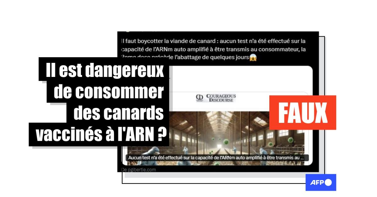 Depuis fin 2023, la France a décidé de rendre obligatoire la vaccination contre la grippe aviaire dans les élevages de plus de 250 canards. Sur les réseaux sociaux, des internautes affirment qu'il serait dangereux pour les humains de consommer ces canards "gavés de vaccin ARN messager". Mais il n'y a pas de risque pour la consommation humaine, affirment les experts interrogés par l'AFP, rappelant que l'ARN contenu dans le vaccin est détruit très rapidement après avoir été administré.