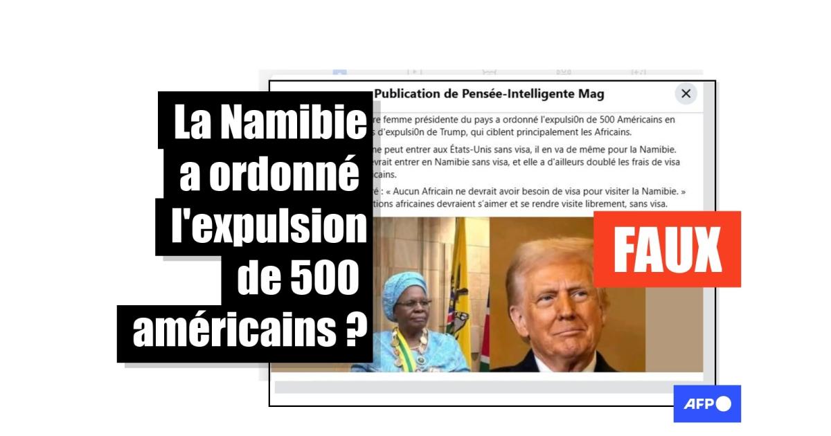 "Namibie : la première femme présidente du pays a ordonné l'expulsion de 500 Américains", affirme un texte vastement partagé courant avril sur les réseaux sociaux, comme dans cette publication cumulant plus de 77.000 mentions "j'aime" et 6.000 partages.