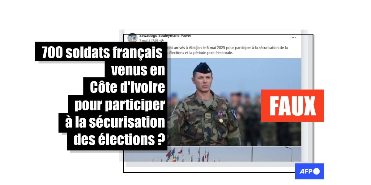 "700 soldats français sont arrivés à Abidjan le 6 mai 2025 pour participer à la sécurisation de la période préparatrice [sic] des élections et la période post électorale", affirme un texte publié sur Facebook le 7 mai 2025.