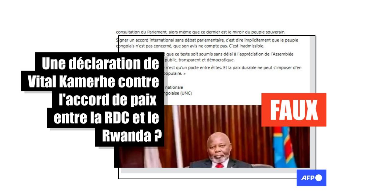 Le 29 juin, deux jours après la signature de cet accord, des dizaines de comptes Facebook basés en RDC ont diffusé un texte présenté comme la "réaction officielle à l’accord RDC-Rwanda" du président de la chambre basse du Parlement congolais, Vital Kamerhe.
