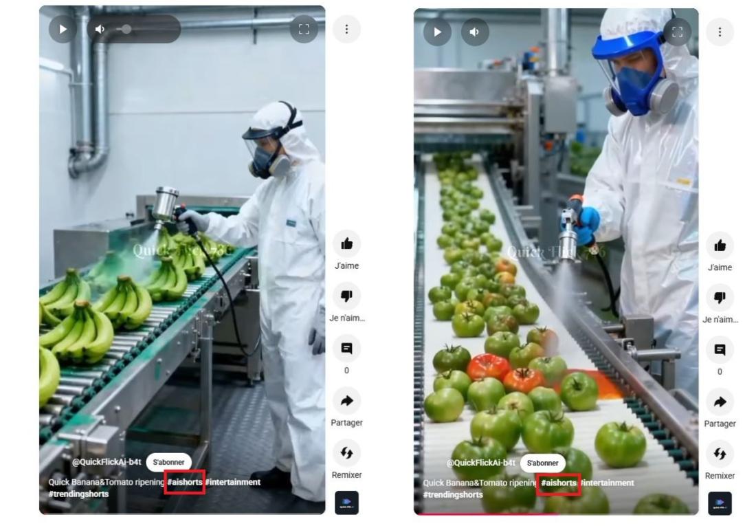 Mais ces deux séquences ont été générées par intelligence artificielle, comme le montrent plusieurs indices visuels, tels que la disparition incohérente des tomates une fois arrivées au bout du tapis roulant, ou encore le fait que certaines bananes arrivent déjà jaunes sur la chaîne de "coloration".