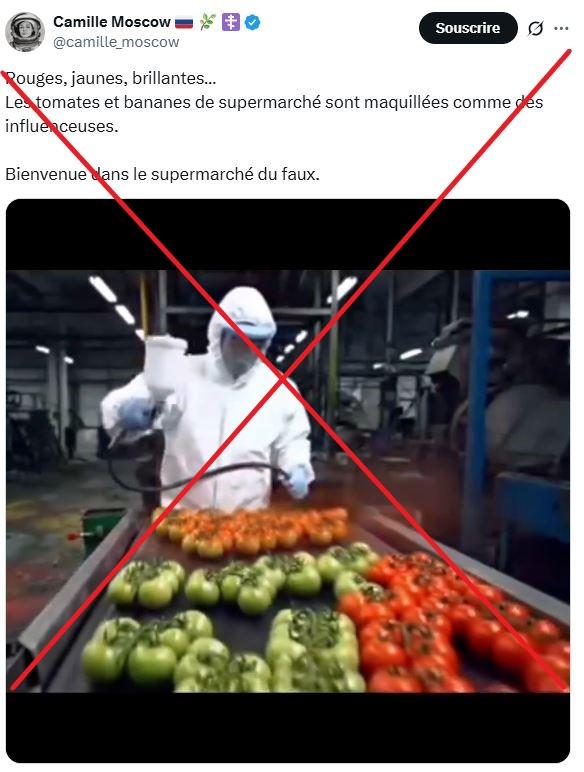 "Rouges, jaunes, brillantes… Les tomates et bananes de supermarché sont maquillées comme des influenceuses. Bienvenue dans le supermarché du faux", peut-on lire en légende d'une vidéo partagée sur X et sur Facebook (1, 2, 3) depuis fin septembre 2025.