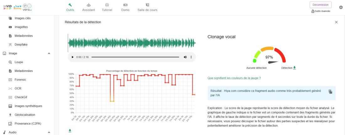 Les voix entendues dans le reportage présentent des accents difficilement identifiables. Une analyse de l'audio de la vidéo par l'AFP, à l'aide du détecteur de deepfakes Hiya.com sur l'outil de vérification InVID-WeVerify, indique que celui-ci a été "très probablement généré par l'IA".