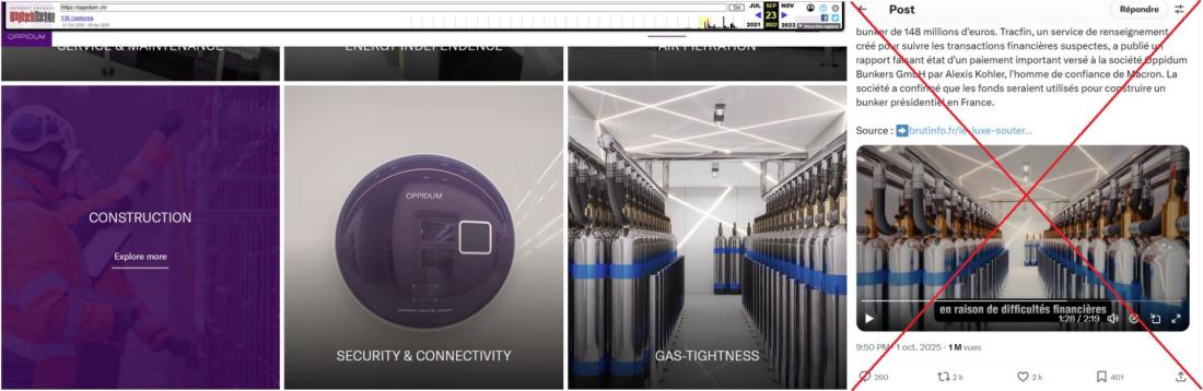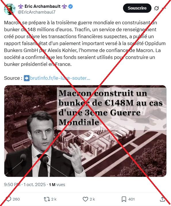 "Tracfin, un service de renseignement créé pour suivre les transactions financières suspectes, a publié un rapport faisant état d'un paiement important versé à la société Oppidum Bunkers GmbH par Alexis Kohler, l'homme de confiance de Macron. La société a confirmé que les fonds seraient utilisés pour construire un bunker présidentiel en France", affirme un internaute connu de l’AFP pour relayer des fausses informations favorables à la Russie. Son message, partagé plus de 2.000 fois, a été vu par plus d’un million de personnes.