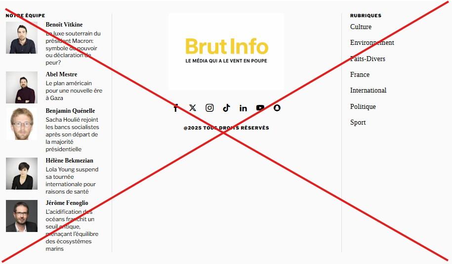 Les publications virales concernant l'histoire du bunker renvoient vers un faux site, intitulé "brutinfo.fr", qui usurpe le nom du média reconnu Brut. Cette plateforme frauduleuse prétend que ses articles sont signés par des journalistes de renom, dont elle détourne en réalité l’identité. La prétendue enquête sur le "bunker de luxe" d’Emmanuel Macron y est, par exemple, attribuée à Benoît Vitkine, journaliste au Monde.