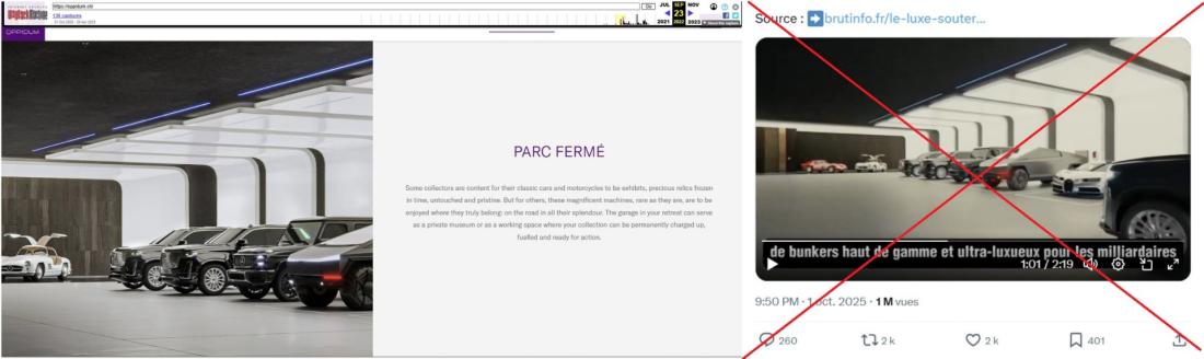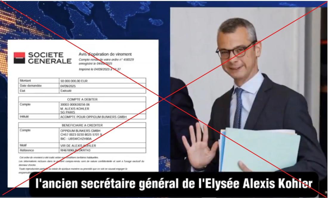 La vidéo montre des images d’illustration d’un bunker ainsi qu’un prétendu ordre de virement de la Société Générale, daté du 4 septembre 2025, d’un montant de 50 millions d’euros, au nom d’Alexis Kohler, ancien secrétaire général de l’Élysée, à destination de la société Oppidum, spécialisée dans la construction de bunkers haut de gamme.