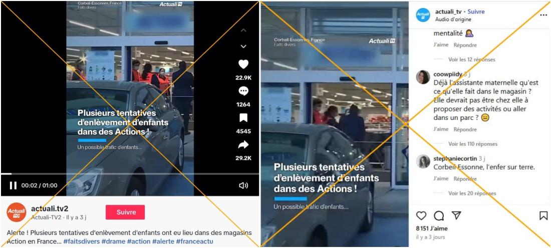 Sur TikTok, des comptes se présentant comme des médias d'actualité amassent des dizaines de milliers d'abonnés en diffusant des informations douteuses. L'un d'entre eux a récemment publié une vidéo relative à plusieurs tentatives d'enlèvement d'enfants qui auraient eu lieu dans des magasins Action, suggérant l'existence d'un possible trafic d'être humains. Mais cette vidéo est trompeuse : elle fait référence à une tentative d'enlèvement d'une fillette de deux ans à Corbeil-Essonnes, en décembre 2023, mais rien ne permet d'établir un lien entre ce fait divers et un supposé trafic d'enfants.