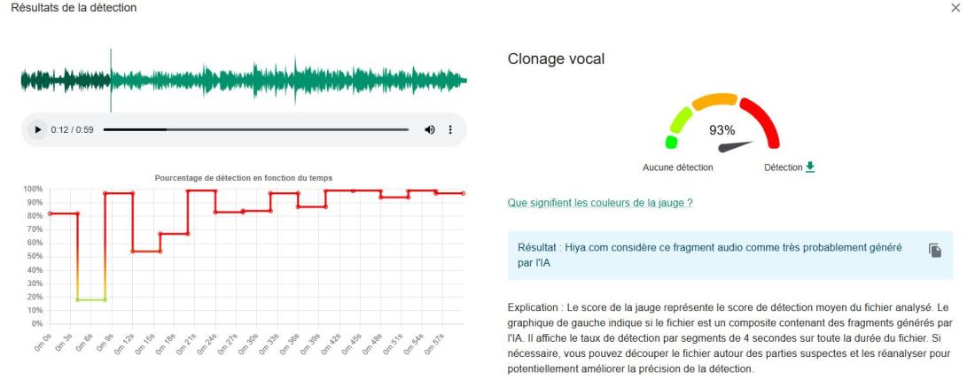 C'est le cas ici, avec des images de magasins Auchan ou d'un restaurant Quick reprises sur les réseaux sociaux, ainsi qu'un audio qui a 93% de chance d'avoir été généré par IA, selon l'analyse du détecteur de deepfakes Hiya.com proposé par l'outil de vérification InVID-WeVerify.