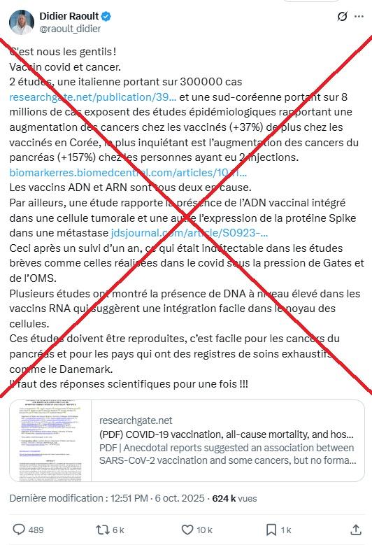 "Vaccin covid et cancer. 2 études [...] exposent des études épidémiologiques rapportant une augmentation des cancers chez les vaccinés (+37%) de plus chez les vaccinés en Corée, le plus inquiétant est l’augmentation des cancers du pancréas (+157%) chez les personnes ayant eu 2 injections", a affirmé dans une publication sur X Didier Raoult, scientifique marseillais qui s'est notamment illustré pendant la crise sanitaire de Covid-19 pour ses prises de position vaccinosceptiques et sa promotion de traitements non éprouvés scientifiquement.
