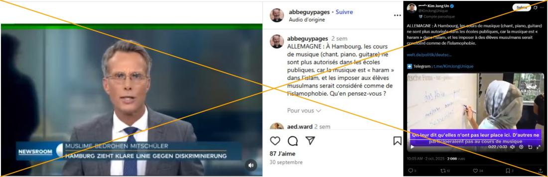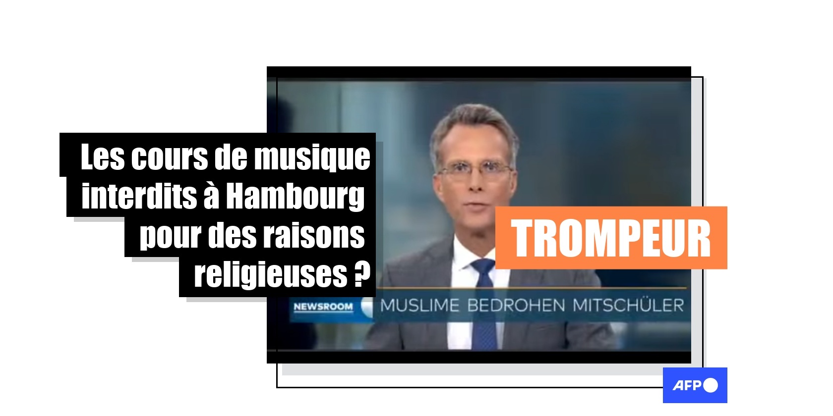 Un média allemand a rapporté en juin 2025 que des élèves musulmans avaient été impliqués dans des actes discriminatoires à l'égard de camarades de classe à Hambourg. Utilisant un extrait vidéo de ce reportage, certains internautes ont affirmé que les écoles publiques de la ville avaient interdit les cours de musique, en raison de leur prétendue incompatibilité avec l'islam. Mais cette allégation est trompeuse : le reportage en question ne mentionne aucune interdiction de ce type, et les autorités ont démenti cette rumeur.