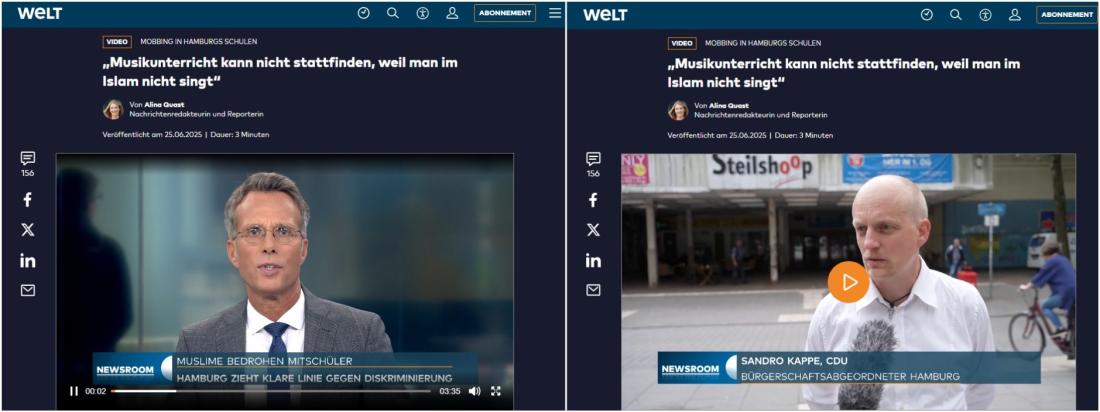Le reportage se termine par une interview de Sandro Kappe, un homme politique conservateur et membre du parlement de Hambourg, qui rapporte des incidents spécifiques dans les écoles de la ville, notamment le refus de certains élèves de participer aux cours de musique (lien archivé ici). D'autres médias allemands (1, 2, 3) avaient également rapporté de tels incidents durant l'été (liens archivés ici, ici et ici).