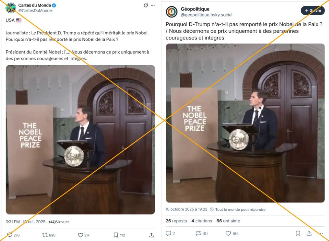 Le jour de la cérémonie, un extrait d'une minute montrant Jorgen Watne Frydnes, président du comité Nobel norvégien, a largement circulé sur les réseaux sociaux (lien archivé ici). Il y répond à une question sur les chances de Donald Trump d'obtenir le prix Nobel. Selon certaines publications - comme ce post sur X daté du 10 octobre - un journaliste lui aurait demandé : "Le Président D. Trump a répété qu'il méritait le prix Nobel. Pourquoi n'a-t-il pas remporté le prix Nobel de la Paix ?". Le président du comité aurait alors répondu : "Nous décernons ce prix uniquement à des personnes courageuses et intègres".