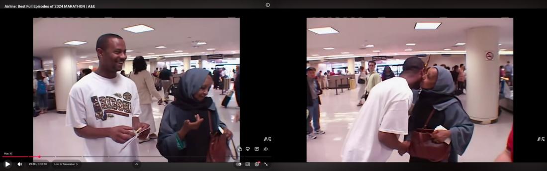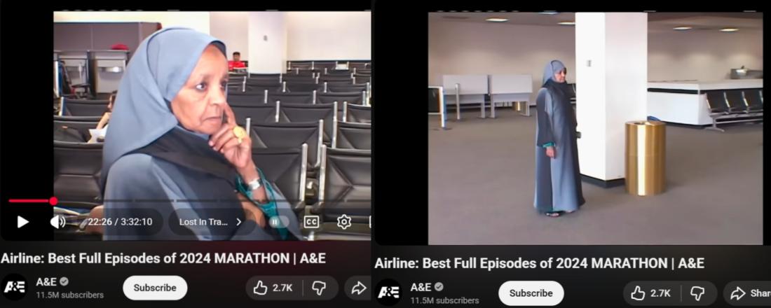 On retrouve notamment la femme voilée de bleu dans une compilation disponible sur YouTube (bien qu'uniquement aux Etats-Unis) (lien archivé ici) : elle apparaît dans l'épisode 11 de la saison 2, "Lost in translation" (lien archivé ici). Il s'agit d'une passagère ne parlant pas anglais, arrivée depuis Baltimore à Los Angeles, et non à New York.