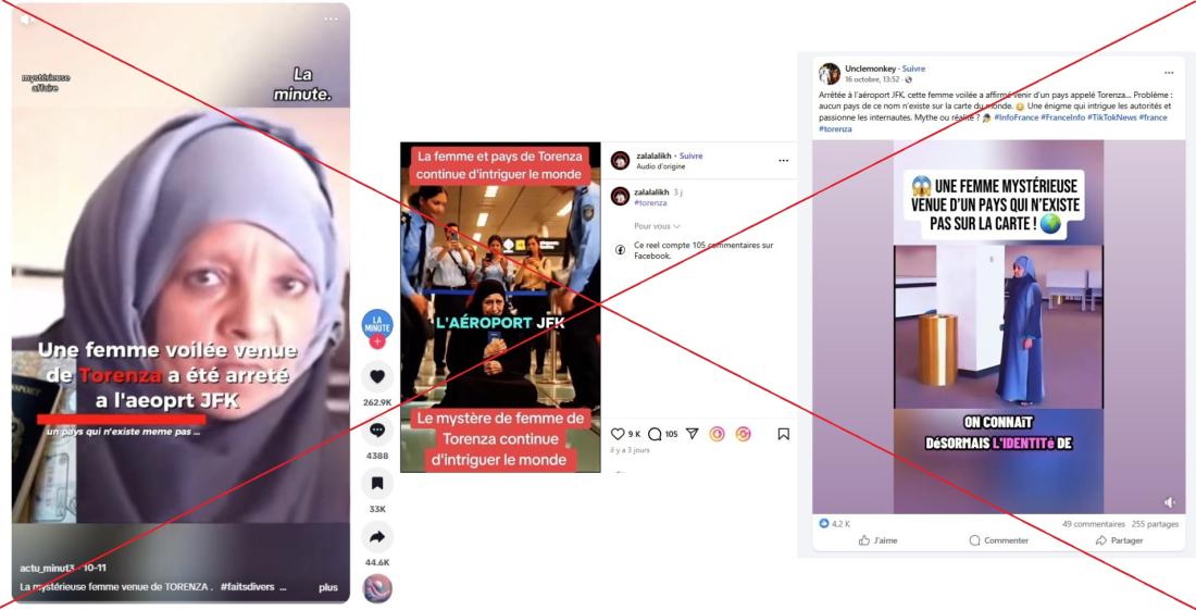 "Une mystérieuse femme voilée venue de Torenza a été arrêtée a l'aeroprt [sic] JFK", peut-on lire dans une vidéo TikTok où défilent des images, datées, d'une femme vêtue de bleu dans un terminal d'aéroport, supposément celui de l'aéroport JFK de New York. La légende de la vidéo affirme quant à elle que la femme est venue d'un "pays qui n'existe pas sur la map [carte, NDLR] du monde". Publiée le 13 octobre 2025, la vidéo cumulait, une dizaine de jours plus tard, plus de 44.000 partages et plus de 310.000 "j'aime".
