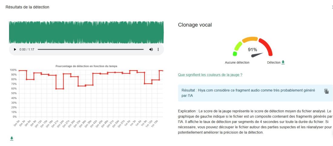 C'est le cas dans les publications relayant l'histoire de la mystérieuse femme voilée. L'analyse du détecteur Hiya.com proposé par l'outil de vérification InVID-WeVerify estime que la bande-son a été générée par IA, selon une probabilité de 91%.
