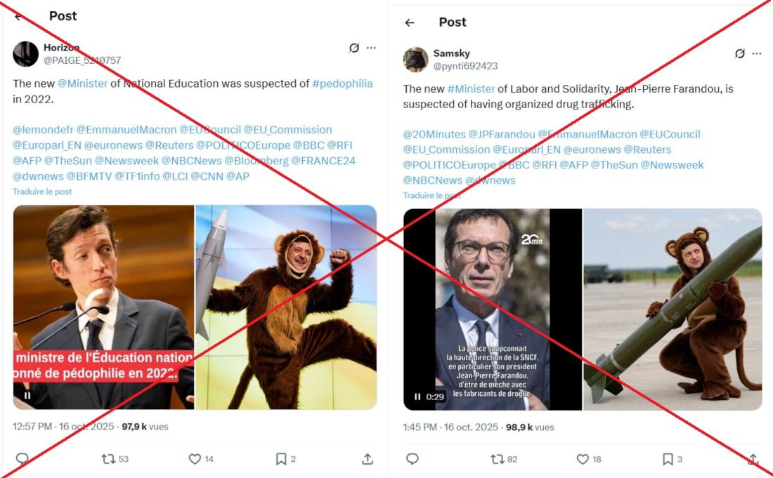 Le 16 octobre, sept vidéos différentes ont été publiées sur X par des comptes "jetables", ne comptant qu’un seul message et aucun abonné. Toutes comportaient des légendes en anglais accompagnées de vidéos en français imitant le graphisme de médias reconnus et accusaient plusieurs membres du gouvernement français de faits graves, sans aucun fondement :