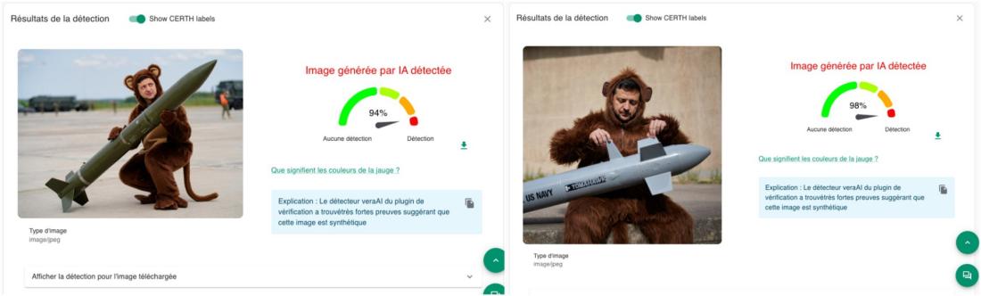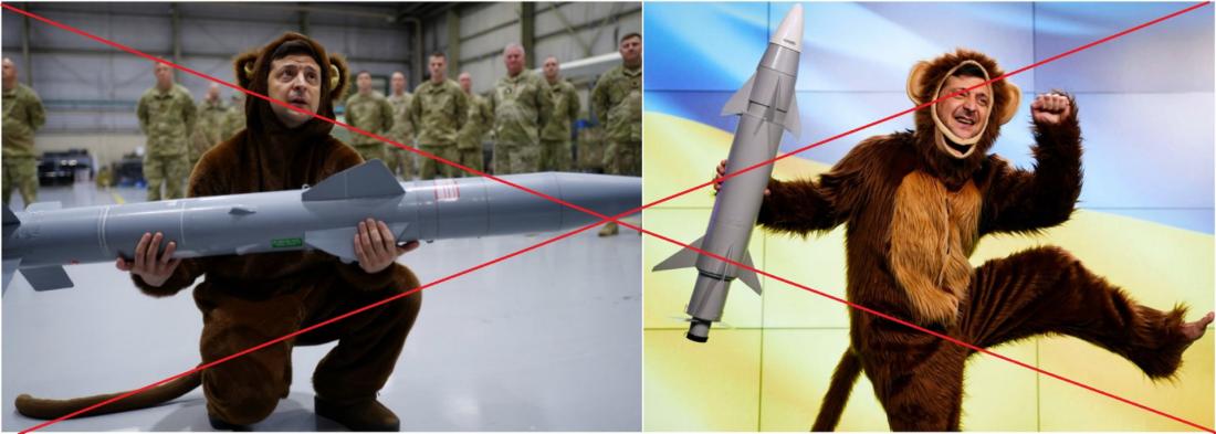 Autre marqueur caractéristique de cette campagne : plusieurs des publications citées plus haut sont accompagnées d'images générées par intelligence artificielle, tournant en dérision le président ukrainien Volodymyr Zelensky, représenté dans un costume de singe.