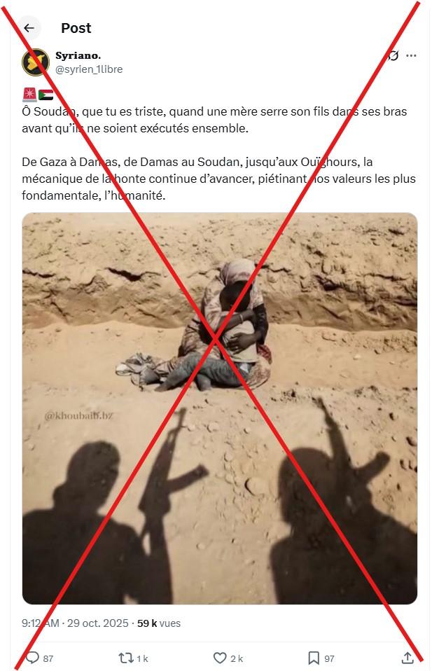 "Ô Soudan, que tu es triste, quand une mère serre son fils dans ses bras avant qu’ils ne soient exécutés ensemble", écrit un internaute sur X, où l’image a été partagée un millier de fois.