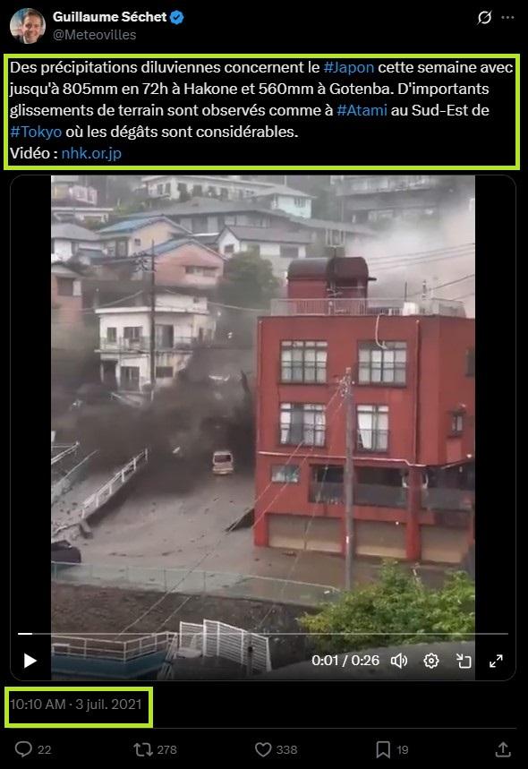 Toutefois, elle vient de ce post X datant du 3 juillet 2021 . L'auteur du post parle de "précipitations diluviennes" et "d'importants glissements de terrain" au Japon (lien archivé ici).