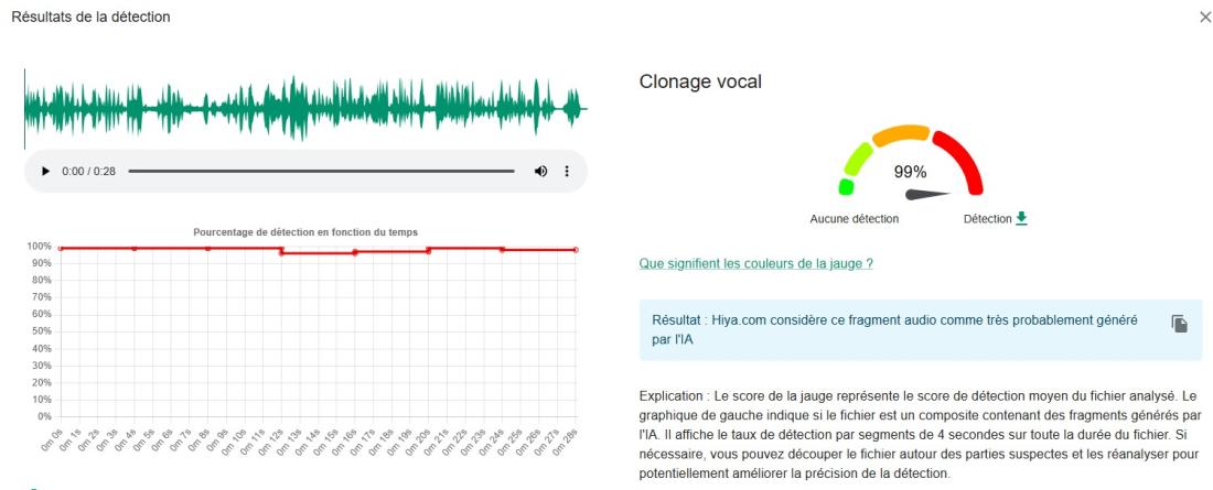 L'audio, quant à lui, a 99% de chance d'avoir été généré par IA, selon l'analyse de l'outil détecteur de deepfakes Hiya.com proposé par InVID-WeVerify.