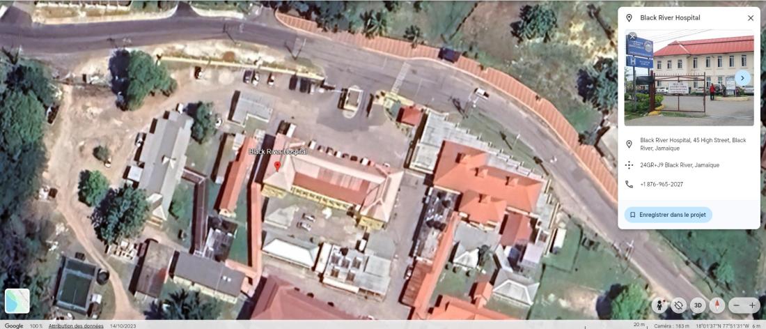 Une recherche par mots-clés sur Google Earth ("Black Saint River hospital Jamaica") a permis à l'AFP de localiser une vue aérienne de l'hôpital Black River. En comparant avec les vues aériennes réelles sur Google Earth, on constate de nombreuses incohérences : la toiture du vrai bâtiment est rouge, et non noire. Certaines fenêtres et structures visibles sur la photo ne correspondent à aucun élément du bâtiment réel.