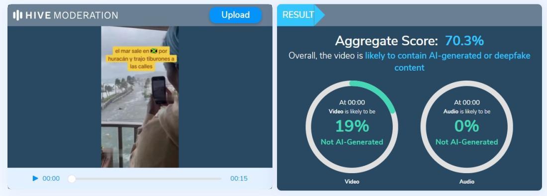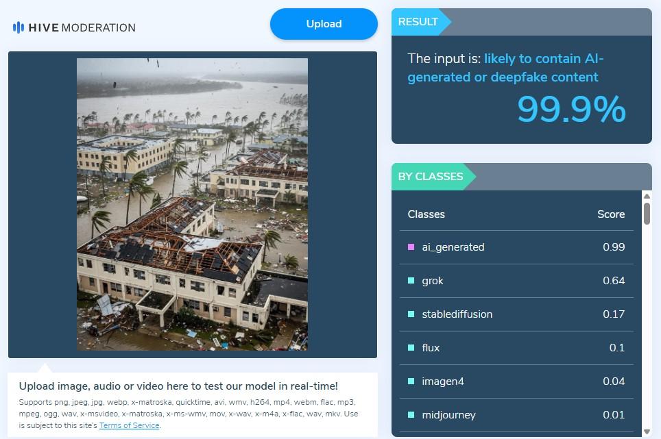 Mais une analyse de l'image effectuée par l'AFP, à l'aide du détecteur de deepfakes sur Hive Moderation, indique qu'elle est "susceptible de contenir du contenu généré par IA" à 99.9 %.