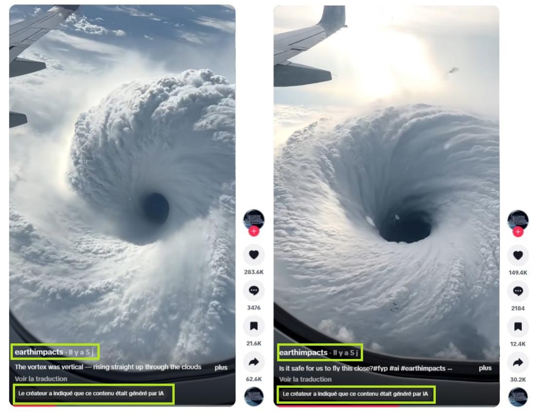 Une recherche d'image inversée permet de retrouver ces deux séquences publiées dès le 26 octobre 2025 sur TikTok - ici et là - par le compte "Earth Impacts". La description de ces publications, écrites en anglais, ne contiennent aucune mention indiquant que l'enregistrement montrerait "l'œil" de l'ouragan Melissa. Dans le coin inférieur de chaque post, il est indiqué que le contenu a été "généré par IA".