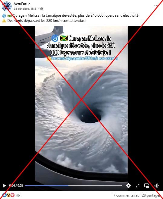 Si les vidéos que nous vérifions ne sont par réelles, de vraies images ont pu être filmées depuis un avion spécialisé de l'US Air Force. Le 27 octobre, un "Hurricane Hunter" ("chasseur d'ouragans" en français) a pu voler dans l'œil de Melissa, pendant qu'il se dirigeait vers la Jamaïque (lien archivé ici).