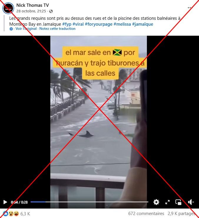 "Les grands requins sont pris au dessus des rues et de la piscine des stations balnéaires à Montego Bay en Jamaïque", assure la légende d'une publication ayant récolté plus de 6.300 "j'aime" et partagée près de 3.000 fois sur Facebook depuis le 28 octobre 2025. Des images similaires circulent en anglais et en espagnol.