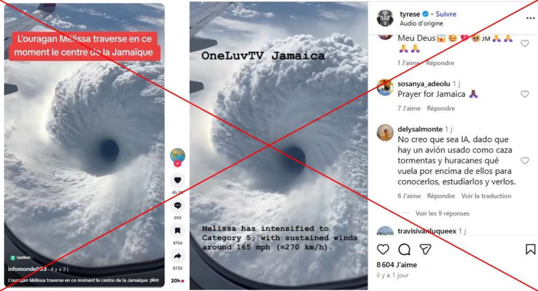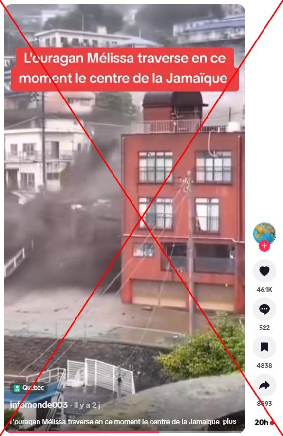 "Un bruit assourdissant et oppressant depuis plusieurs heures. L'ouragan Mélissa traverse, en ce moment, le centre de la Jamaïque", peut-on entendre dans une vidéo TikTok, partagée près de 9.000 fois et cumulant près de 2 millions de vues, depuis le 29 octobre 2025.